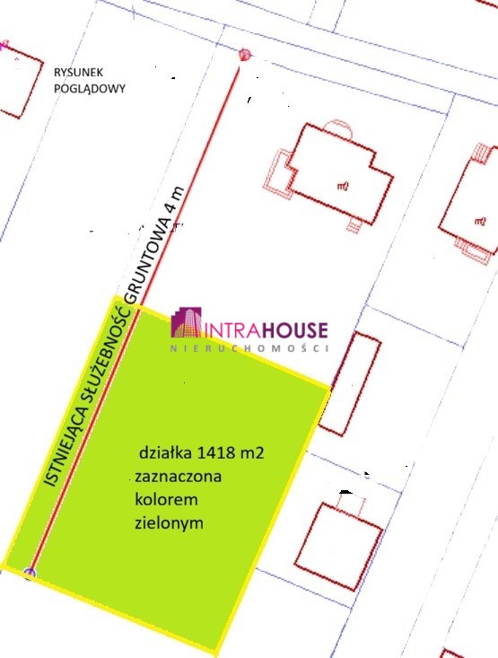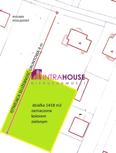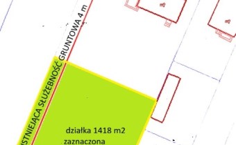 Działka o pow. 1418 m2 w tym służebność drogowa 4 m, Przybliżony wymiar 42m x 30 (front 42).